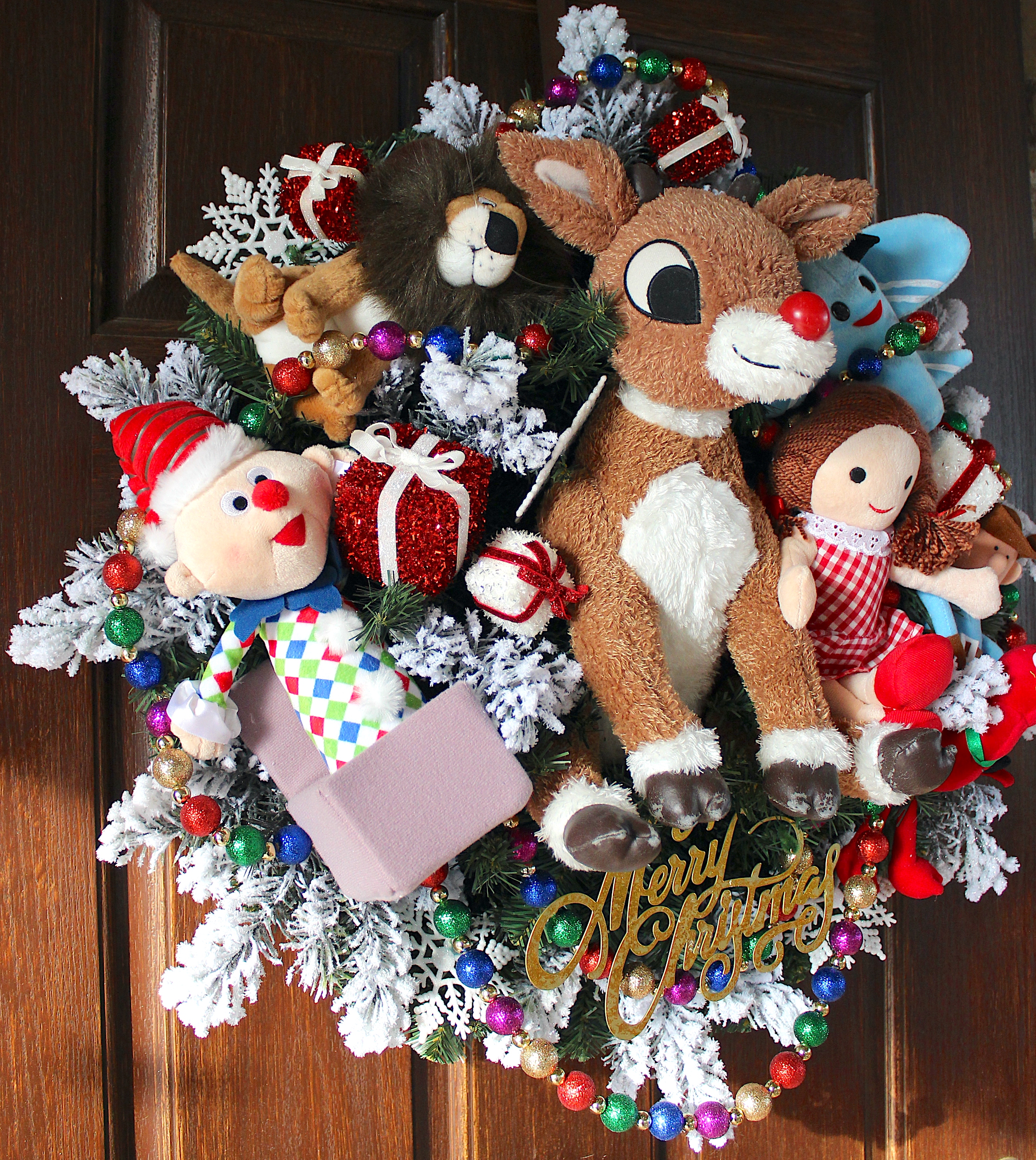 Krylon Ultra UV Floral Protectant Spray [ Available at Michaels Craft Stores] helps prevent fading, but will not protect against moisture damage and mildewing— so if your front door gets wet when it rains- the wreath will too. If not, it should be good for several months outside.